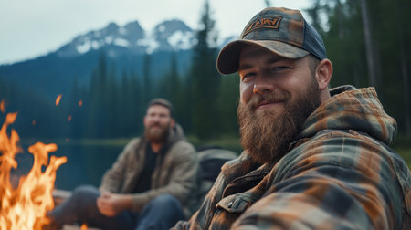 This outdoor photo captures the heart of friendship Two men relax by a campfire, their bond mirroring the flickering flames The serene lakeside scene creates a cozy, warm atmosphere, ideal for nature lovers It's an invitation to explore friendship through the lens of a memorable camping adventure AI Generative