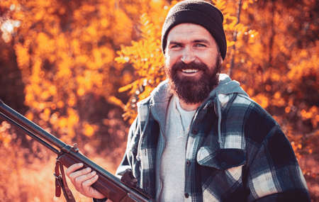 Closed and open hunting season. Hunter with shotgun gun on hunt. Close up Portrait of hamdsome Hunter.