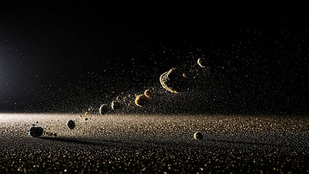 A celestial arrangement of rocks and dust particles in a dark, star-filled expanse, illuminated by a dramatic light source.