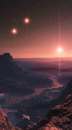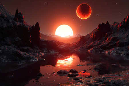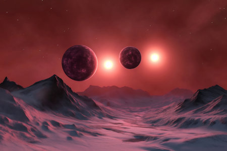Snowy mountain range on a hypothetical exoplanet with two suns and an Earth like atmosphere orbiting a binary red dwarf star system