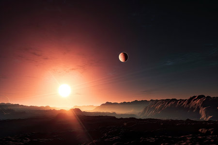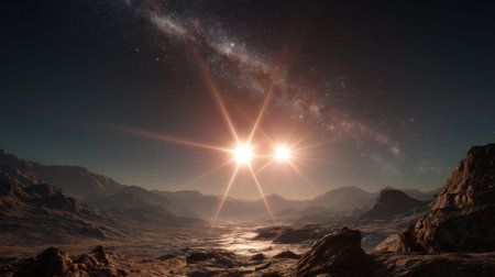 binary star sunset casting double shadows on exoplanet, created with generative ai