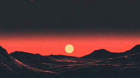 An abstract, digital illustration of a stylized sunset with wavy mountains and stars in the sky.