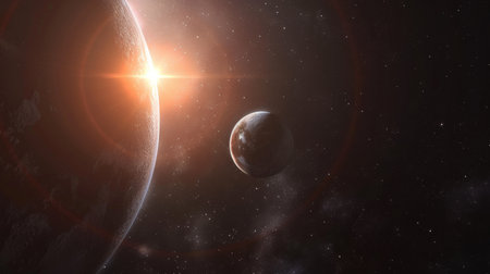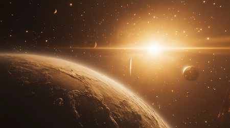 Stunning cosmic view featuring planets and an illuminating sun in a star-filled background, perfect for space-themed projects and illustrations.
