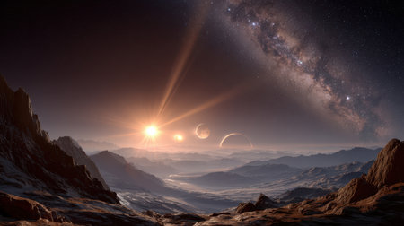 A breathtaking cosmic landscape features distant suns casting a soft glow over rocky terrain and distant planets.