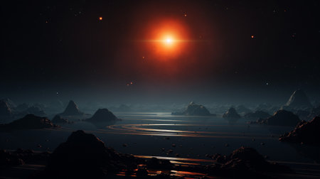 Red futuristic planet in outer cosmic space of solar system. Terraforming of fantastic planet. Elements of fabulous fantastic concept. Cartoon generate ai illustration. Copy ad text space