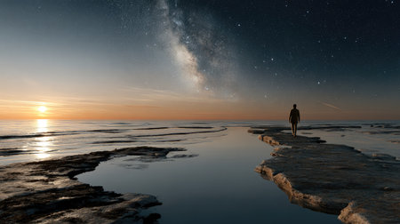 A stunning view captures a solitary figure walking on a rocky coastline at sunset, with the Milky Way shining bright above, evoking feelings of serenity.