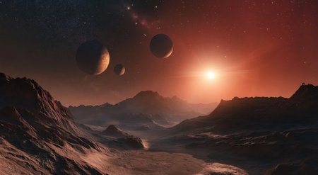 A view of an exoplanet landscape with multiple moons and stars in the sky, space art, space background, starscape, planets, planets orbiting each other, planets in the distance, space. --ar 78:43 --v 6.1 Job ID: 56cc62b8-2370-4c9c-8f50-90c3103fdfbc