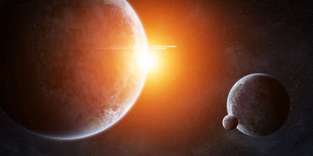 Distant planet system in space with exoplanets during sunrise 3D rendering