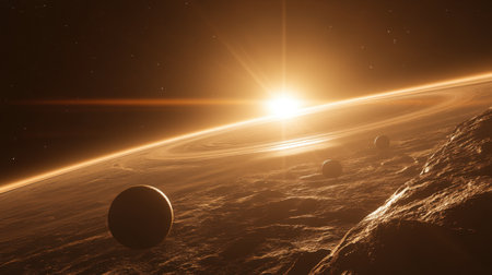 Breathtaking view of a sunrise over a planetary landscape, showcasing a glowing star, multiple moons, and majestic ring formations in a vast cosmic setting. Perfect for science and space-themed projects.