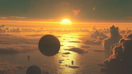 A breathtaking cosmic landscape featuring a vibrant sunset over an ocean, with celestial bodies and clouds creating a tranquil and surreal atmosphere perfect for artistic inspiration.