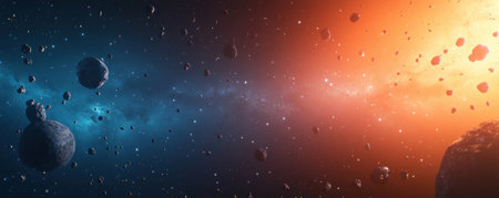 A stunning cosmic landscape showcasing asteroids and distant stars.