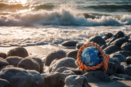 An AI generated illustration of a blue buoy with orange rope on a rocky seashore