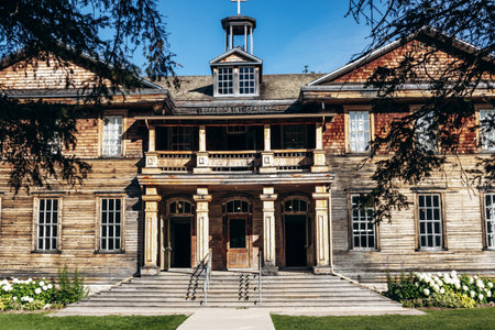 Chambord, Canada - August 18, 2025: Exterior of the restored Couvent-ecole Saint-Georges-de-la-Ouiatchouan (convent school) built in 1915 at Val-Jalbert Historical Village, abandoned in 1927