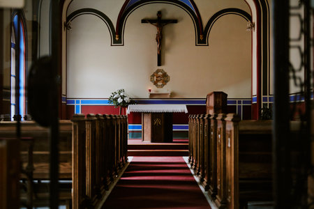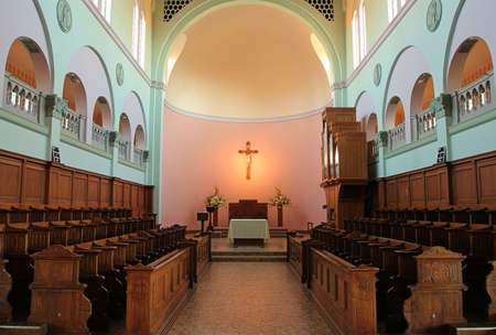 No people wide shot of Catholic church interior with nave, sanctuary and altar in early morning
