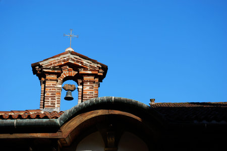 Cross and bell on the roof, detail on blue sky