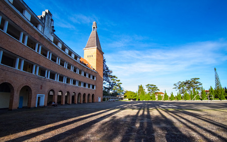 In Lam Dong, Vietnam - May 10, 2014: Arched architectural beauty, rustic buildings Pedagogical University in sunny with red roofing tiles impressive pines in Da Lat city, Lam Dong, Vietnam