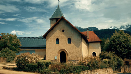 A small church in Saint-Martin-dUriage with the French Alps as background