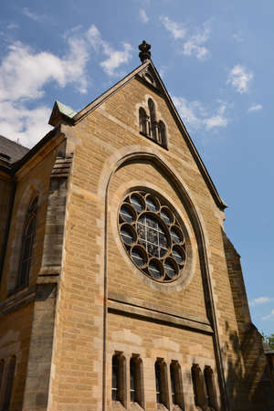 Exterior of the church building Heart of Jesus with a round window wheel and a statue of the crucified Jesus on a background of blue sky. With text space. Germany.