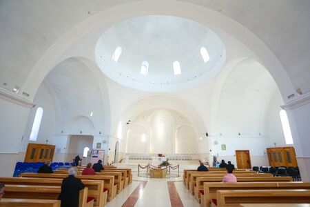 Udbina, Croatia - October 8, 2019 : Modern new Church of the Croatian Martyrs made 2010 year.The cornerstone was blessed by the Pope John Paul II. People praying inside of the church.
