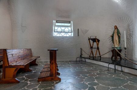 Mexico, Valle de Bravo March 26, 2021, view of the maera benches and a stained glass window in the background inside the chapel of the Casa De Oración Carmel Maranatha.