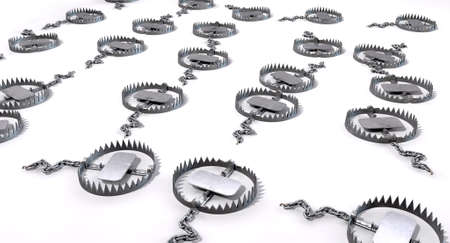 A collection of randomly set out metal animal traps attached to the ground with metal chains on an isolated background