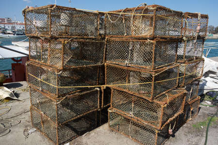 Metal fishing nets in a port. Horizontal shot
