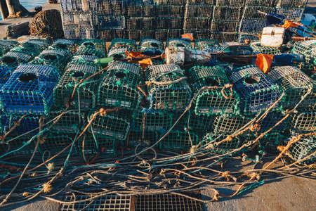 Closeup of black plastic and mesh fishing traps ropes and gear stacked on a dock near the sea