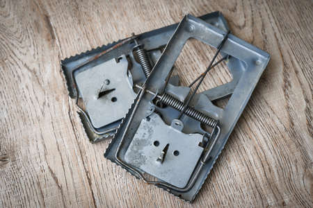 Mousetrap on an old wooden table. Metal accessories for extermination of small rodents. Dark background.