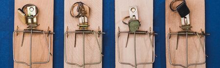 Panoramic shot of mouse traps with jewellery rings on blue background