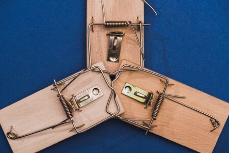 Top view of wooden mouse traps on on blue surface
