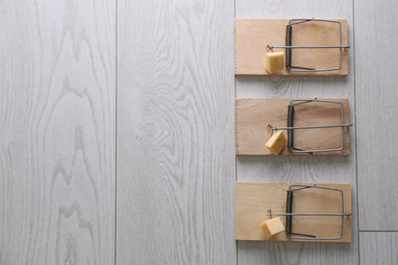 Mousetraps with pieces of cheese and space for text on white wooden background, flat lay. pest control