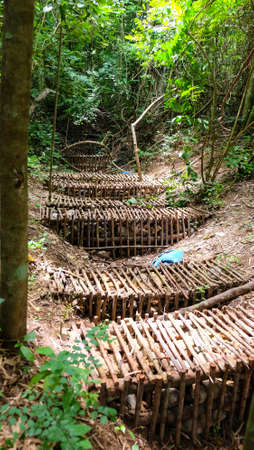 Vertical view of various metal fishing traps and scattered ropes. Close-up view of crab cage stacked on the floor of a fishing pier. Stack lobster or crab traps and braided ropes on the dock