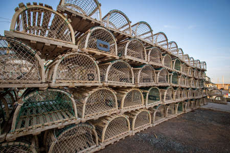 Stacks of wooden lobster traps on pier in North Rustico, Prince Edward Island, Canada.