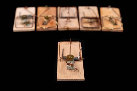 Mousetraps with pieces of cheese on wooden background, closeup. pest control
