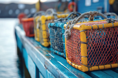 Fisher village boardwalk features colorful octopus crates amid a tranquil atmosphere, evoking nostalgia and maritime charm.