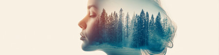 Double exposure of a woman's head connecting with nature and winter forest. Woman's profile merging with snowy pine forest
