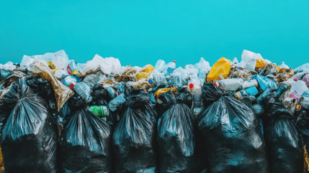 This image captures a striking view of a pile of black garbage bags overflowing with plastic waste, emphasizing the pressing environmental challenges posed by pollution.