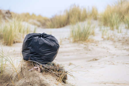 A black plastic bag full of litter that was collected by volunteers cleaning up the coast and dunes in The Netherlands.