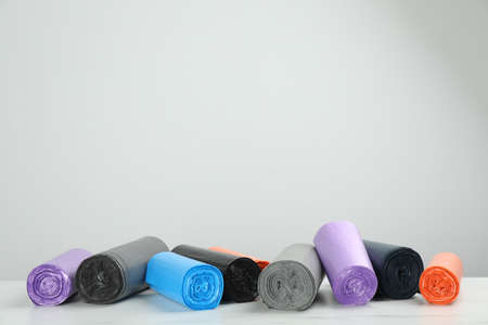 Rolls of different color garbage bags on table against light background. Space for text