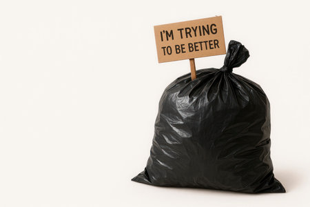 A bag of garbage with a sign saying I'm trying to be better. Space for text