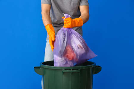 Young man throwing garbage in trash bin on color background