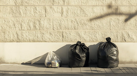 This image captures a scene of urban waste management, featuring three refuse sacks—two opaque black bags and one transparent bag—positioned against a textured stone wall on a paved surface.
