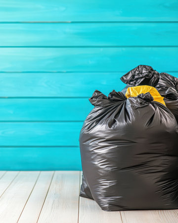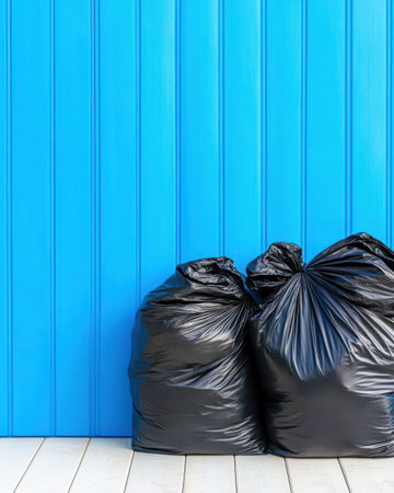 Black garbage bags against a white wall, horizontal arrangement. Waste management and cleanliness concept