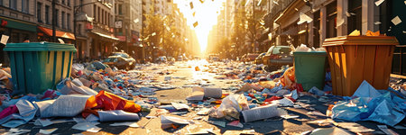 Colorful waste scattered about a windy city street with cars, buildings, and people, illuminated by a bright, intense morning or evening sunlight.