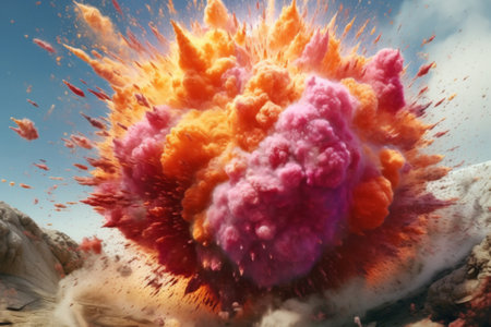 A stunning visualization of an explosion of dust and sand against a bright orange background, capturing the dynamic energy and textures of nature