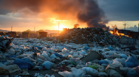 This striking photo captures the devastating effects of environmental pollution. The air is thick with smog, and the surrounding landscape is littered with garbage and debris. Generative AI