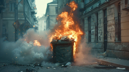A striking image captures fierce flames rising from burning refuse on an urban street, with thick smoke billowing in the background. The scene evokes feelings of destruction and urgency in a gritty environment.