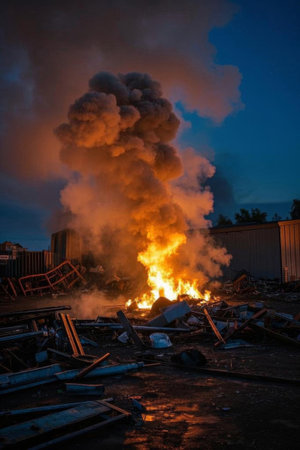 A vivid scene of a fire igniting from a trash pile in an industrial area, surrounded by containers and litter, showcasing environmental concerns.