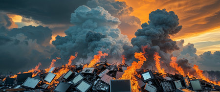 AI Generated. massive dump of electronic waste burning under dramatic sky