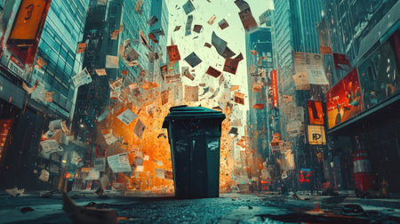 A vibrant urban backdrop with a rubbish bin surrounded by falling ticker tapes and financial symbols, representing economic inefficiencies